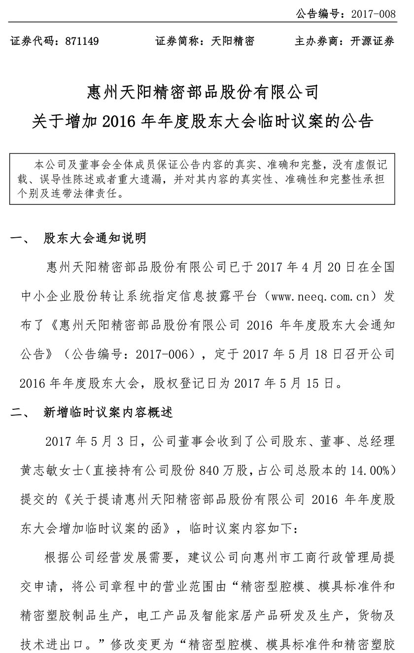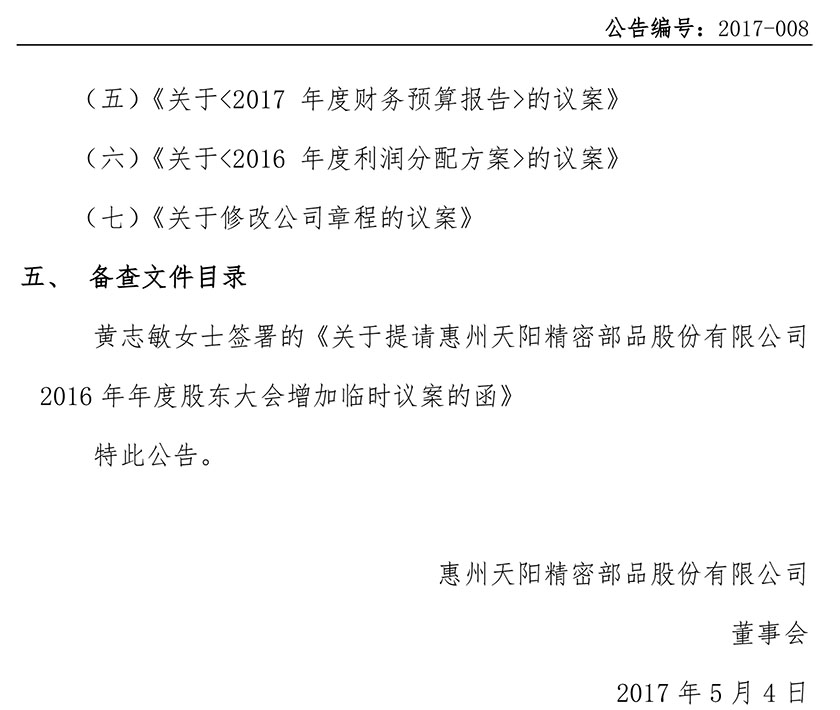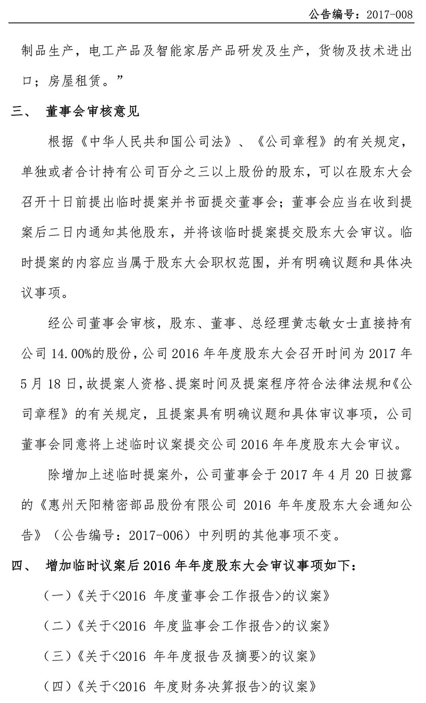 关于增加2016年年度股东大会临时议案的公告 2017-008